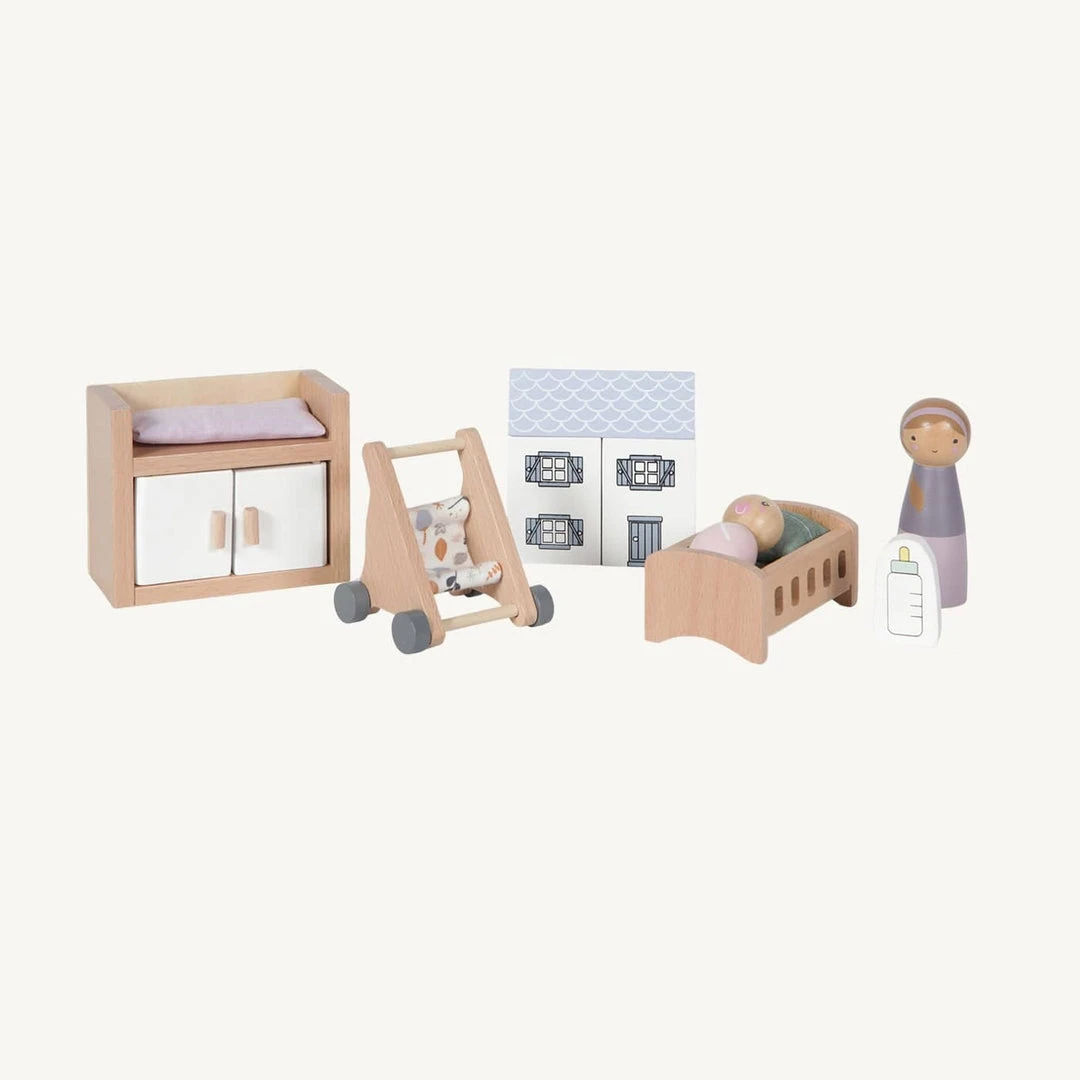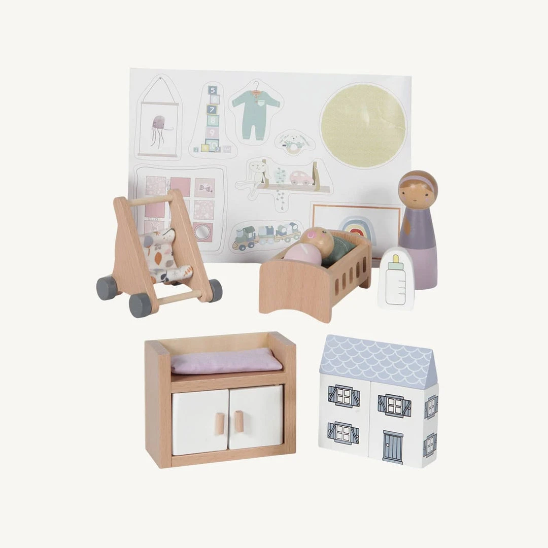 Doll’s House Children’s Room Playset. The perfect addition to the Little Dutch Doll’s House. In this playset you will find cute pieces of nursery furniture and lovely accessories that make you want to play with the Little Dutch doll’s house even longer. Stickers are included to give your own unique look and feel to the house.
