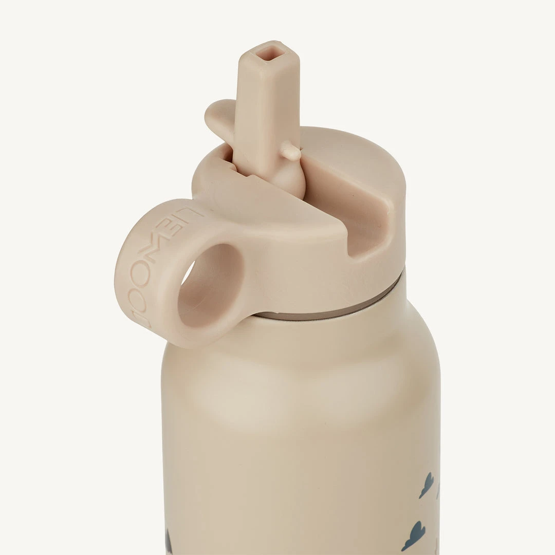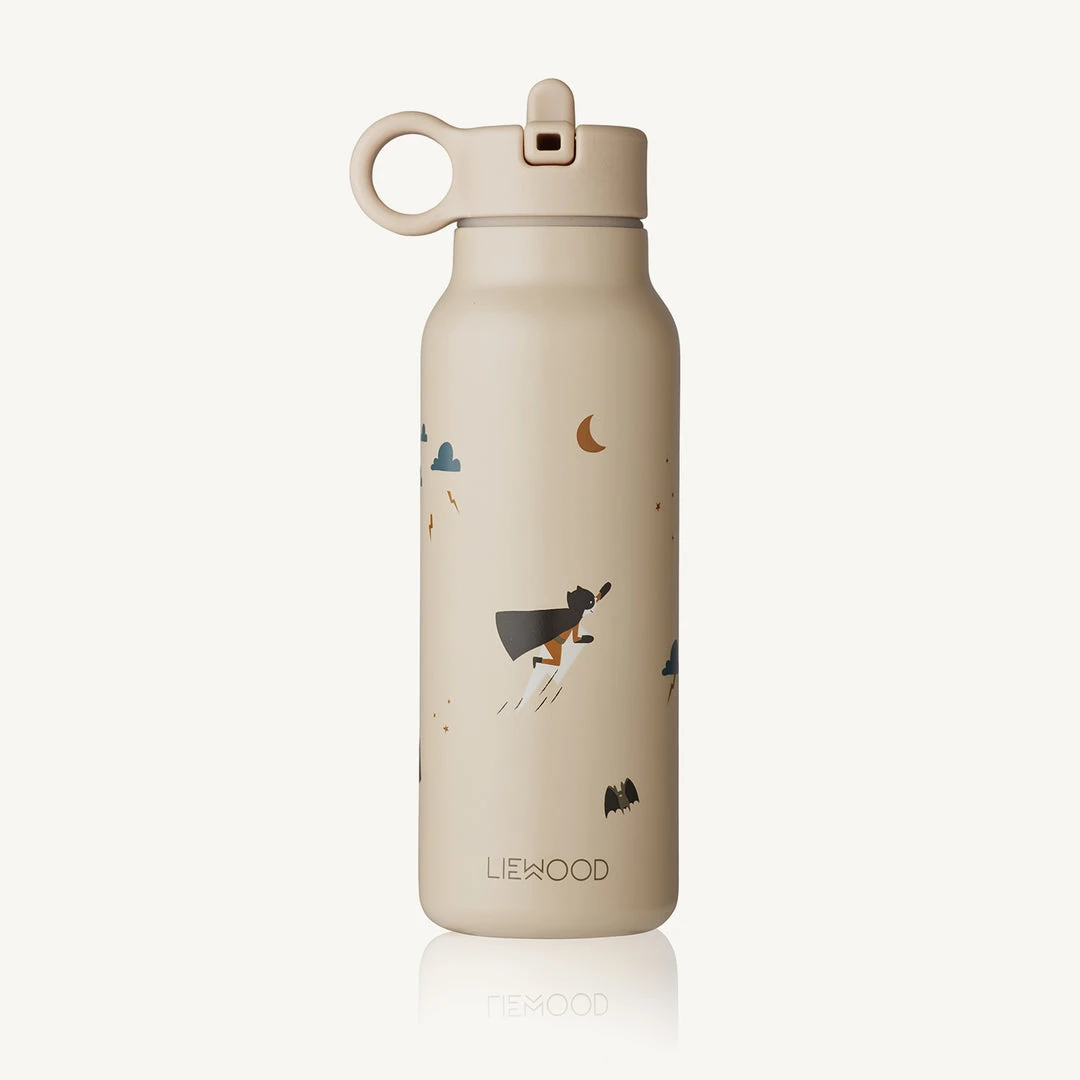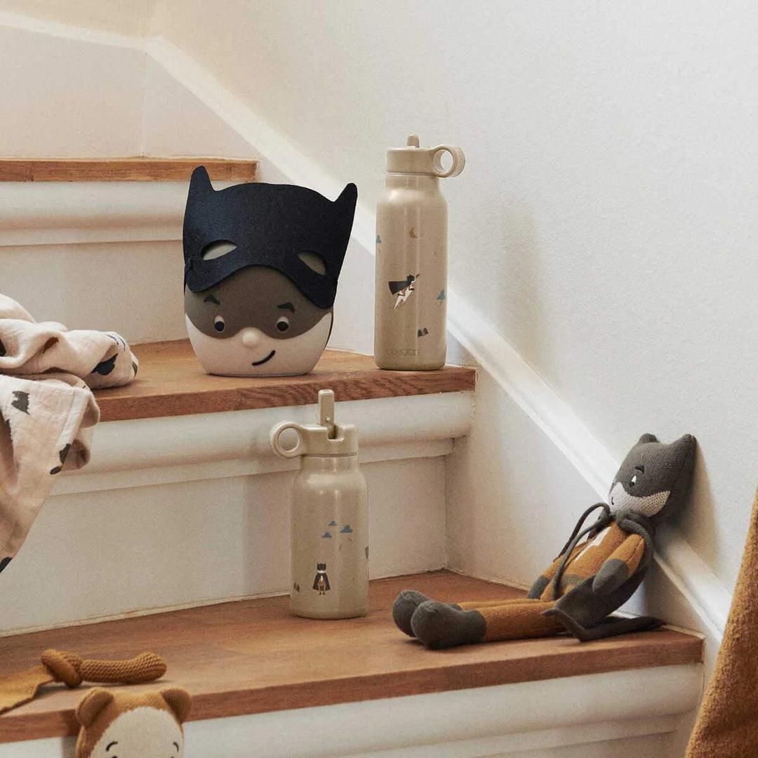 Falk Water Bottle 350 ml – Superhero / Dune Mix by Liewood. Stylish and practical, this large stainless steel water bottle is perfect for every day use and keeping hydrating on the go. Made from the best quality steel on the market – 18/8 premium steel, the Falk Water Bottle has a thermal function and keeps liquids both hot and cold.