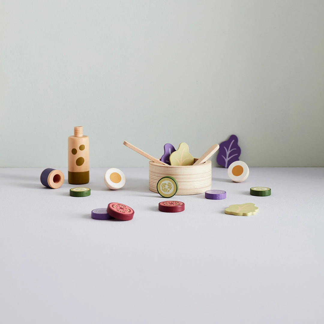 KID’S HUB Salad Set by Kid’s Concept. This wooden salad set from the Kid’s Hub concept is perfect when it’s time to play restaurant. The bowl is made of plywood and has a high edge so you can see the fine grain on the side. But a salad bowl is nothing without its toy food. In this yummy salad, you will find egg halves, lettuce leaves, tomatoes, cucumber slices and red onion. Don’t forget to unscrew the bottle cap and top everything off with olive oil. Mix around with the salad cutlery and voilà – a super yummy lunch for your friends. And if you need the lunch to-go? Just pack it up in the paper bag that comes with it. Suitable for ages 3 years+