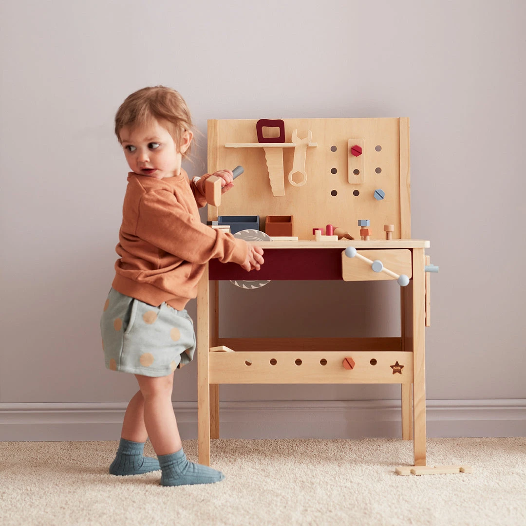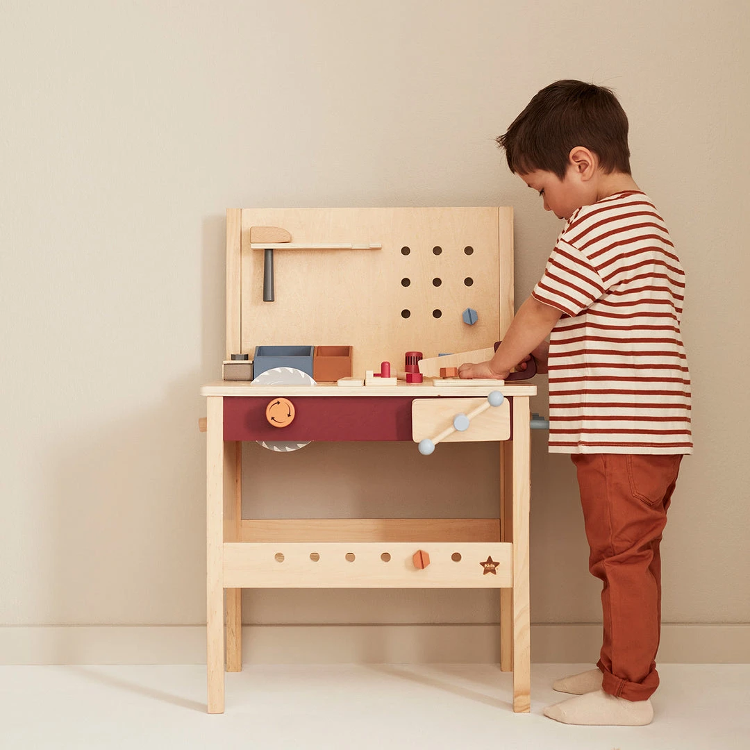 KID’S HUB Tool Bench by Kid’s Concept. Designed in Scandinavia and beautifully handcrafted in high quality wood, this fantastic kids tool bench is perfect for your aspiring little carpenters and DIY enthusiasts. So now there is nothing the mini-carpenter can’t repair or assemble. The bench has holes where you can attach screws, nails and building plates. The illustrations on the tabletop show where you can screw and where you can hammer. There is also a toy circular saw that spins when you turn the knob. Definitely, something that suits those who are planning any huge construction projects. And don’t forget. When everything is ready, you can clamp your construction and sandpaper your masterpiece to make it smooth. Choose between two different sandpapers (hook-and-loop) that you can screw on and off. The play tool bench also has smart drawers, shelves and hooks that hold all your toy tools in place. Suitable for ages 3 years+