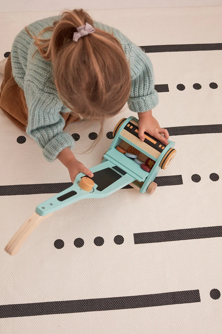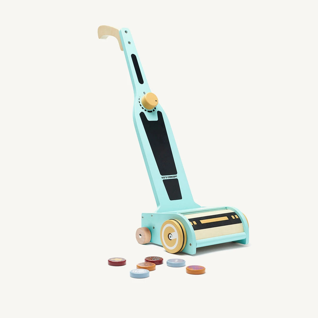 KID’S HUB Vacuum Cleaner by Kid’s Concept. A wooden vacuum cleaner for children. A fun activity for kids to use while adults clean. Place the magnetic dirt discs on the floor and roll the vacuum cleaner over and see them disappear by sticking to the bottom of the vacuum cleaner. When you’ve finished cleaning, store the dirt in the small compartment. This activity toy stimulates children’s imagination and motivates them to learn early to help with everyday chores.