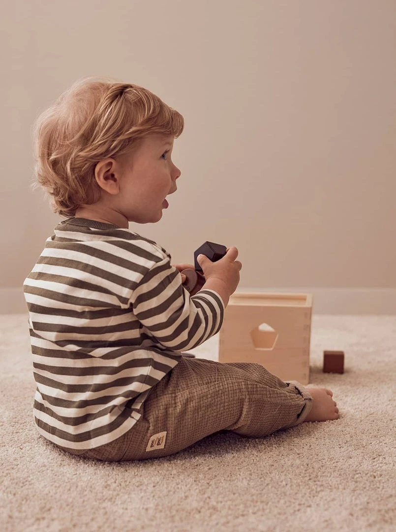 Neo Wooden Shape Sorter Box Natural Box by Kid’s Concept. A classic toy that encourages the learning of different kinds of geometric shapes to help develop fine motor skills and co-ordination. This natural wooden sorter box comes with three different dark and light wooden blocks in different shapes that fit in the corresponding holes. Treated with a transparent water-based lacquer. The removable sliding lid means you can easily turn the box upside down to empty it. Once your child has placed all the blocks in the cube, you can just open the lid and start again. Made from FSC-certified wood.