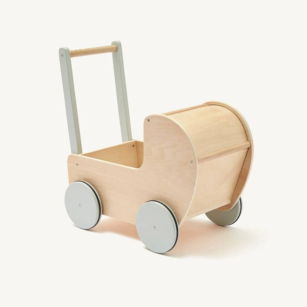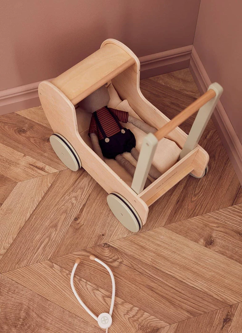 Dolls Pram in Natural Wood / Dusty Green by Kid’s Concept. Designed in Scandinavia and lovingly hand crafted in natural wood, this beautiful dolls pram has been specifically designed for little people to enjoy, and what little girl or boy wouldn’t love this? Not only is it beautifully designed but it’s built to last and the strong and sturdy design is great for helping new walkers stay steady on their feet. The pram also comes with a lovely off white cotton bedsheet and cushion, and features shock absorbing rubber rings on the wheels.