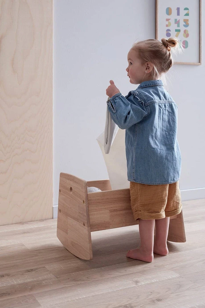 Dolls Rocking Cradle in natural rubber wood by Kids Concept. Designed in Scandinavia and lovingly hand crafted in natural rubber wood, this lovely dolls rocking cradle is a beautiful addition to any home where children love playing with dolls. The set also include a pillow and duvet in 100% cotton.