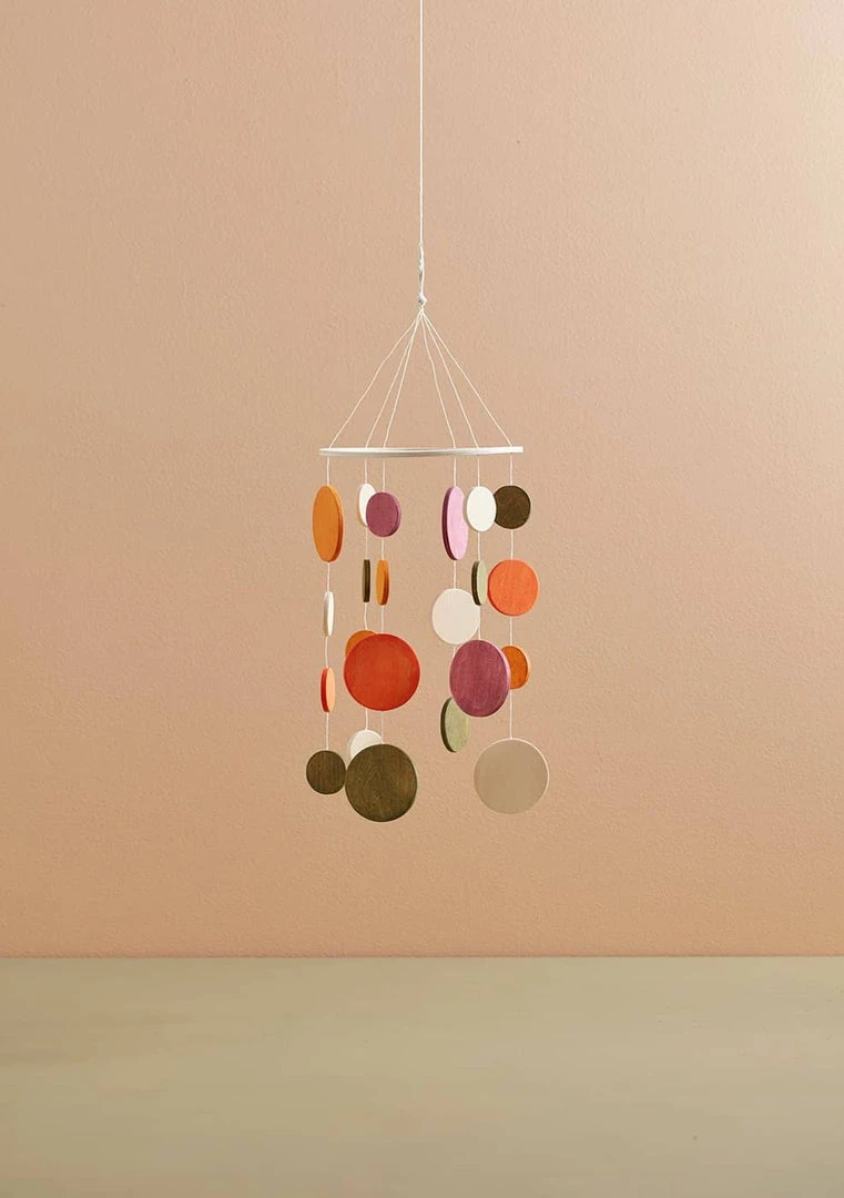 Wooden Baby Mobile by Kid’s Concept. This beautiful decorative wooden mobile in orange and purple tones is an adorable accessory for your child’s nursery. Babies love to watch the colourful circles and they gently spin and sway above them. The mobile can be hung above a cot or changing station and is perfect for keeping babies entertained during nappy changes as well as developing their senses.