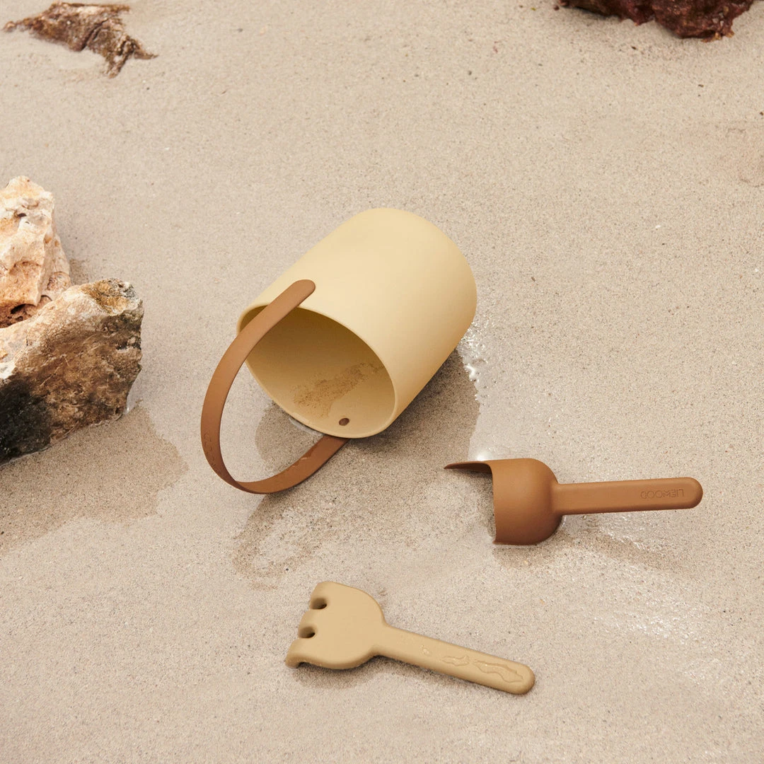 Donny Beach Set by Liewood. The perfect play set for sunny beach days and playing in the garden. This lovely set includes a bucket with handle, shovel and rake. All beautifully made in eco-friendly, durable material, designed for hours of fun!