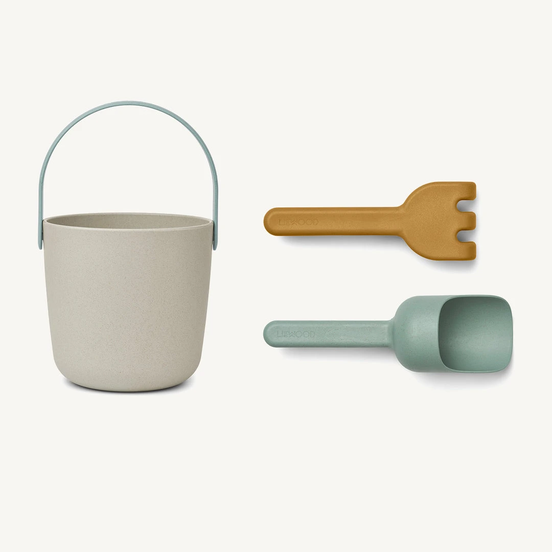 Donny Beach Set by Liewood. The perfect play set for sunny beach days and playing in the garden. This lovely set includes a bucket with handle, shovel and rake. All beautifully made in eco-friendly, durable material, designed for hours of fun!