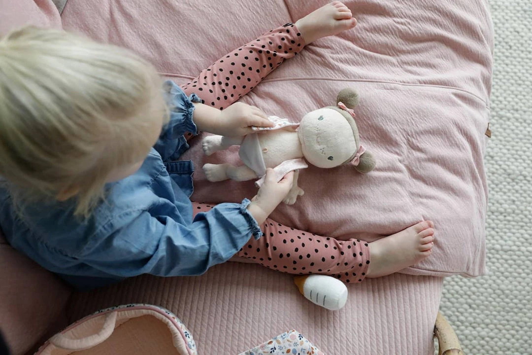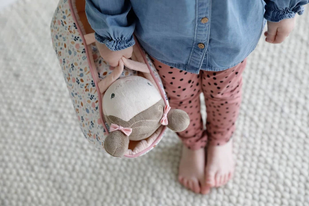 Baby Doll Rosa Play Set by Little Dutch. Meet little baby Rosa. This sweet Little Dutch plush doll wants to be cuddled and carried around. Baby Rosa will become friends with every little girl or boy. They can feed her with the bottle or calm her down with the dummy. They can change her nappy, put on a cap, and tuck her in with a blanket. Baby Rosa also enjoys going on a trip in her cute travel basket. By looking after Rosa, children learn to take up a caring role in a playful way. They can tell baby Rosa all their secrets. She won’t tell anyone. She is wonderfully soft to nestle up against, which gives children a feeling of safety.