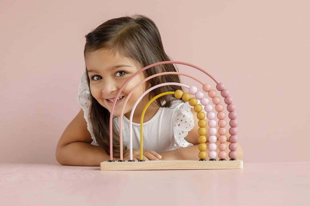 Wooden Rainbow Abacus in Pink by Little Dutch. A classic toy, given a modern twist, this gorgeous Rainbow Abacus is a lovely addition to any playroom or living room. The rainbow is made of coloured metal arches on a wooden base with 10 wooden beads on each arch. This is a lovely educational toy that makes learning maths fun and helps your child develop skills in recognising patterns and colours, while honing fine motor skills.