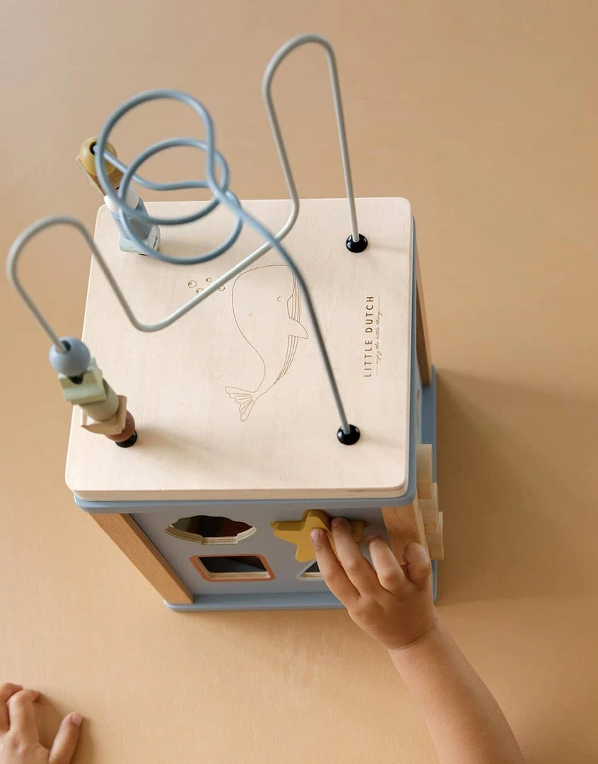 Wooden Activity Cube Ocean by Little Dutch. This wooden activity cube provides plenty of challenges for children. Each side features wonderful marine animals of the Ocean collection and offers a different educational activity, including a shape sorter, turning gears, puzzles and a fun bead spiral on top. With each activity, children develop their fine motor skills and are encouraged to use their creativity. This toy captivates children’s curiosity and brings lots of fun.