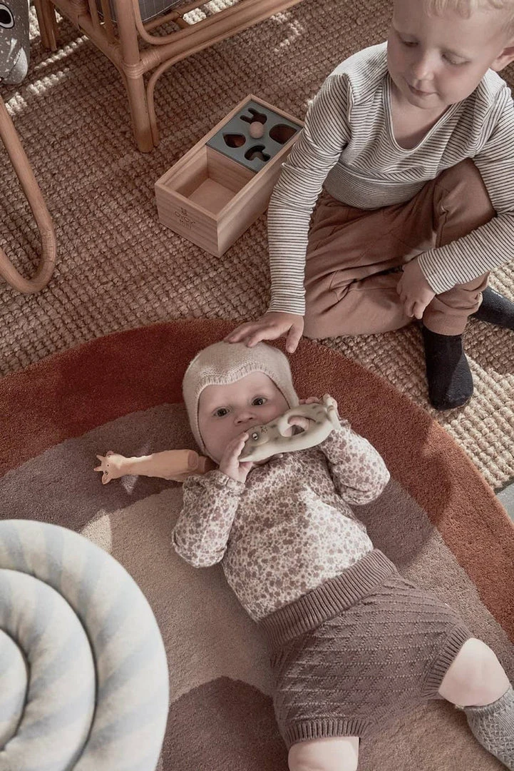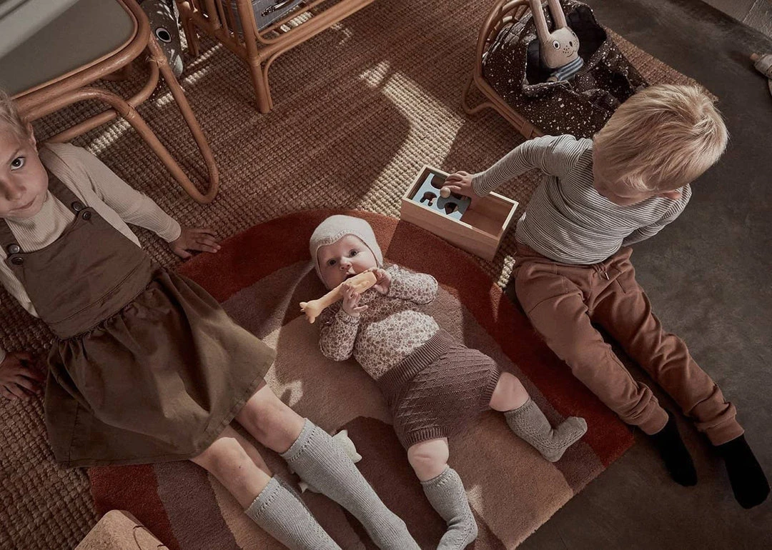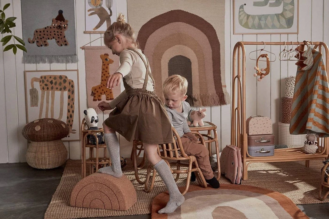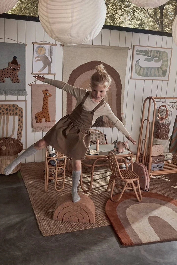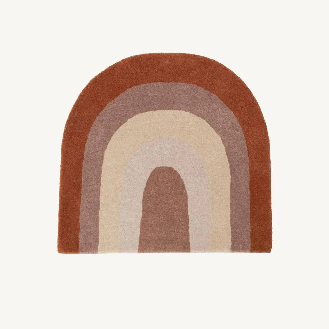 Rainbow Rug in Choko by OIOI. This beautiful rainbow design rug is a stunning addition to any kids room or living room. The soft muted colours blend beautifully in the home, giving it a lovely warm feeling, perfect for rainbow themed rooms and mixing other rainbow accessories! Whether sitting or laying down, these super soft rugs provide a comfy place to play and rest. Match with OYOY’s ‘Follow the Rainbow’ wall rug in Choko to create your dream rainbow themed room.