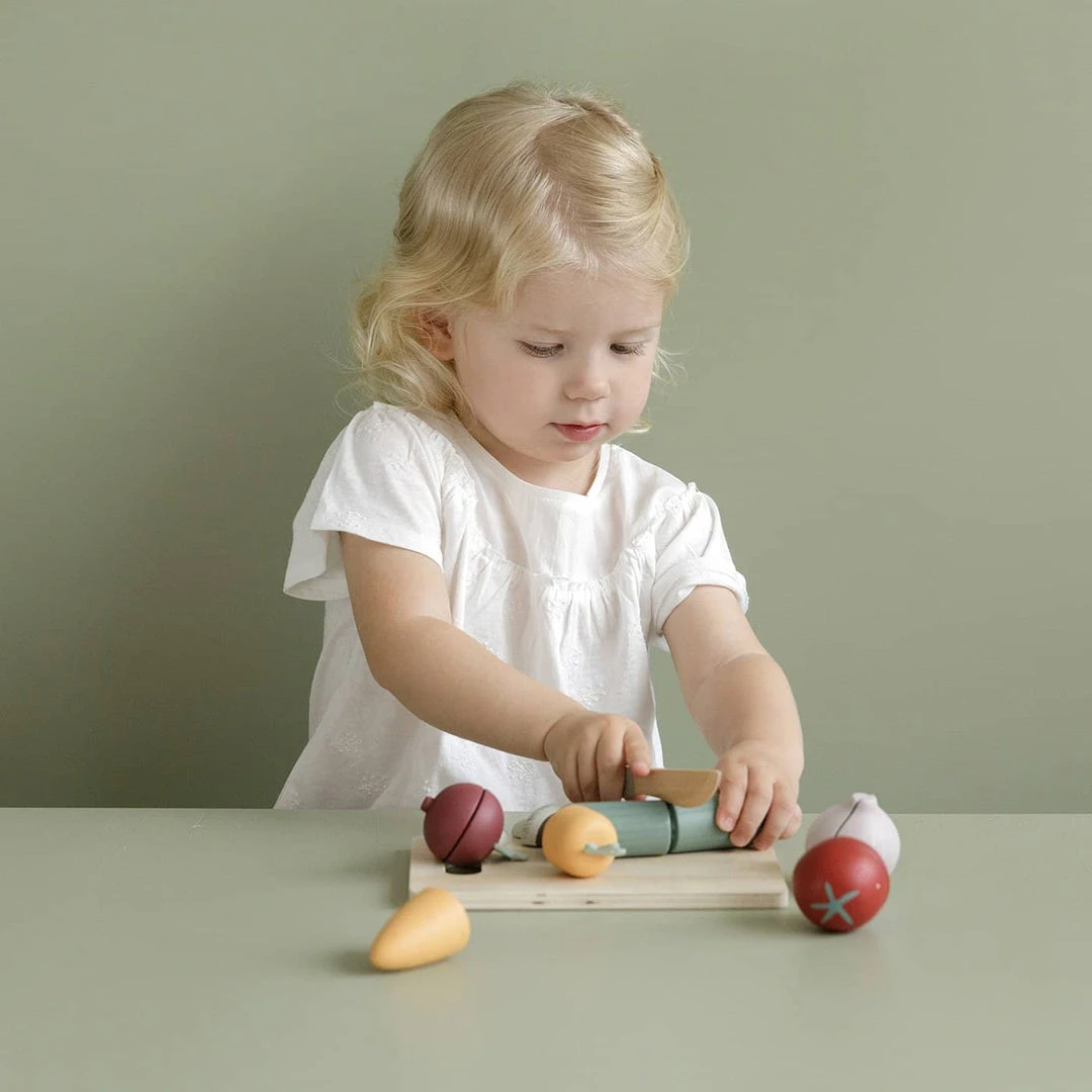 Wooden Cutting Vegetables Play Set by Little Dutch. Encourage your little ones to get their ‘5-a-day’ with this lovely wooden vegetables play set. The set includes a cutting board, wooden knife and 6 vegetables; carrot, mushroom, cucumber, tomato, onion and beet root. The vegetables can be cut in half and put easily back together with velcro. This is a lovely play set for anyone who loves role play and perfect for using alongside our fantastic range Pretend Play Toys including the Little Dutch Market Stand, Cutting Fruit, Kitchen.