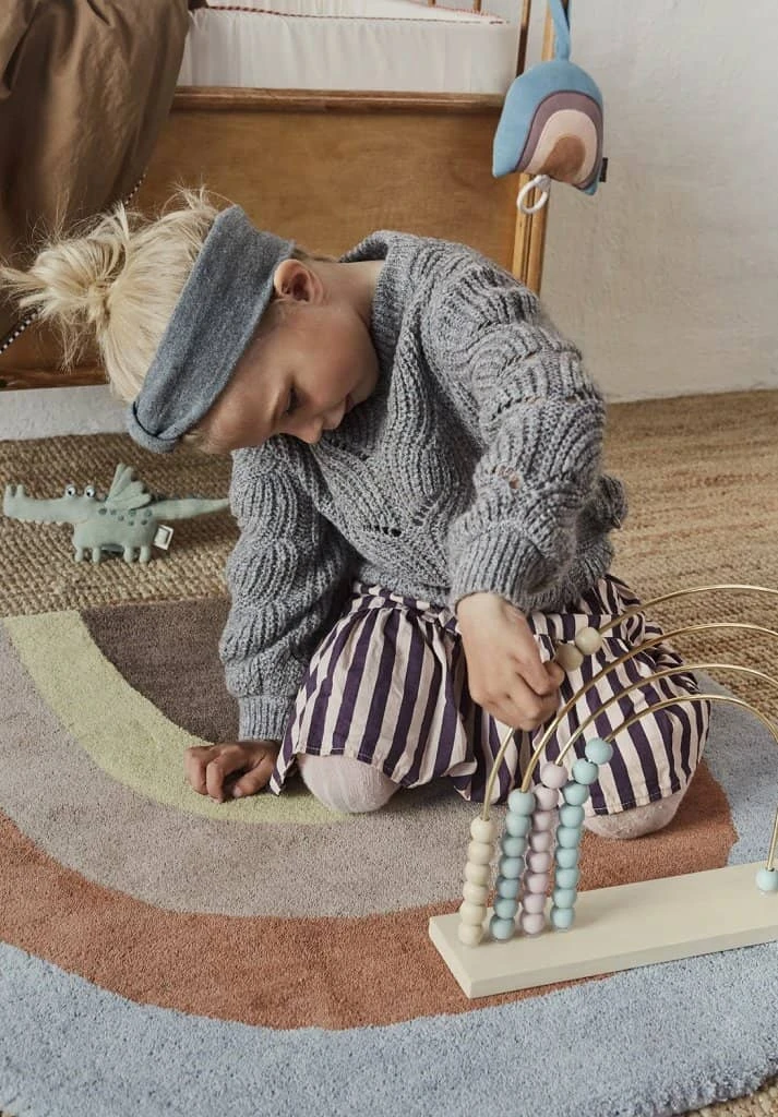 Rainbow Rug by OIOI. This beautiful rainbow design rug is a stunning addition to any kids room or play room. The soft muted colours blend beautifully in the home, giving it a lovely warm feeling, perfect for rainbow themed rooms and mixing other rainbow accessories! Whether sitting or laying down, these super soft rugs provide a comfy place to play and rest. Match with the OYOY ‘Follow the Rainbow’ wall rug to create your dream rainbow themed room.