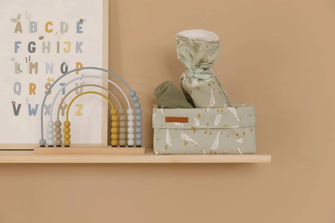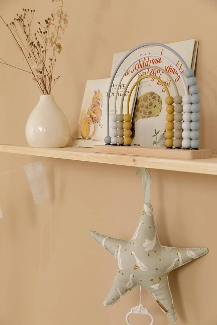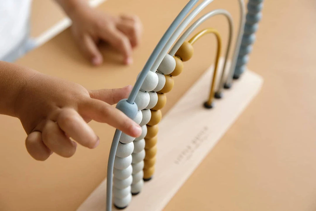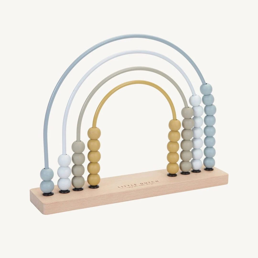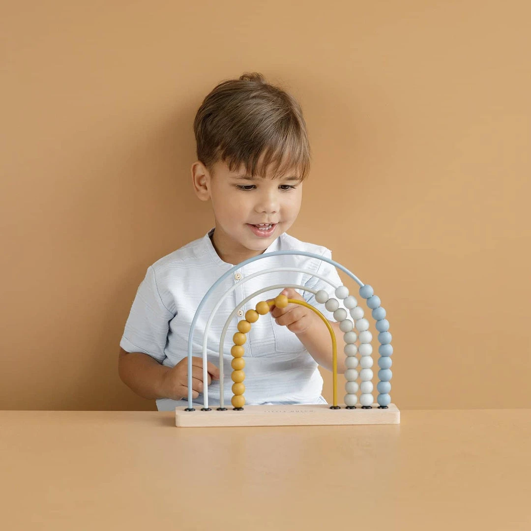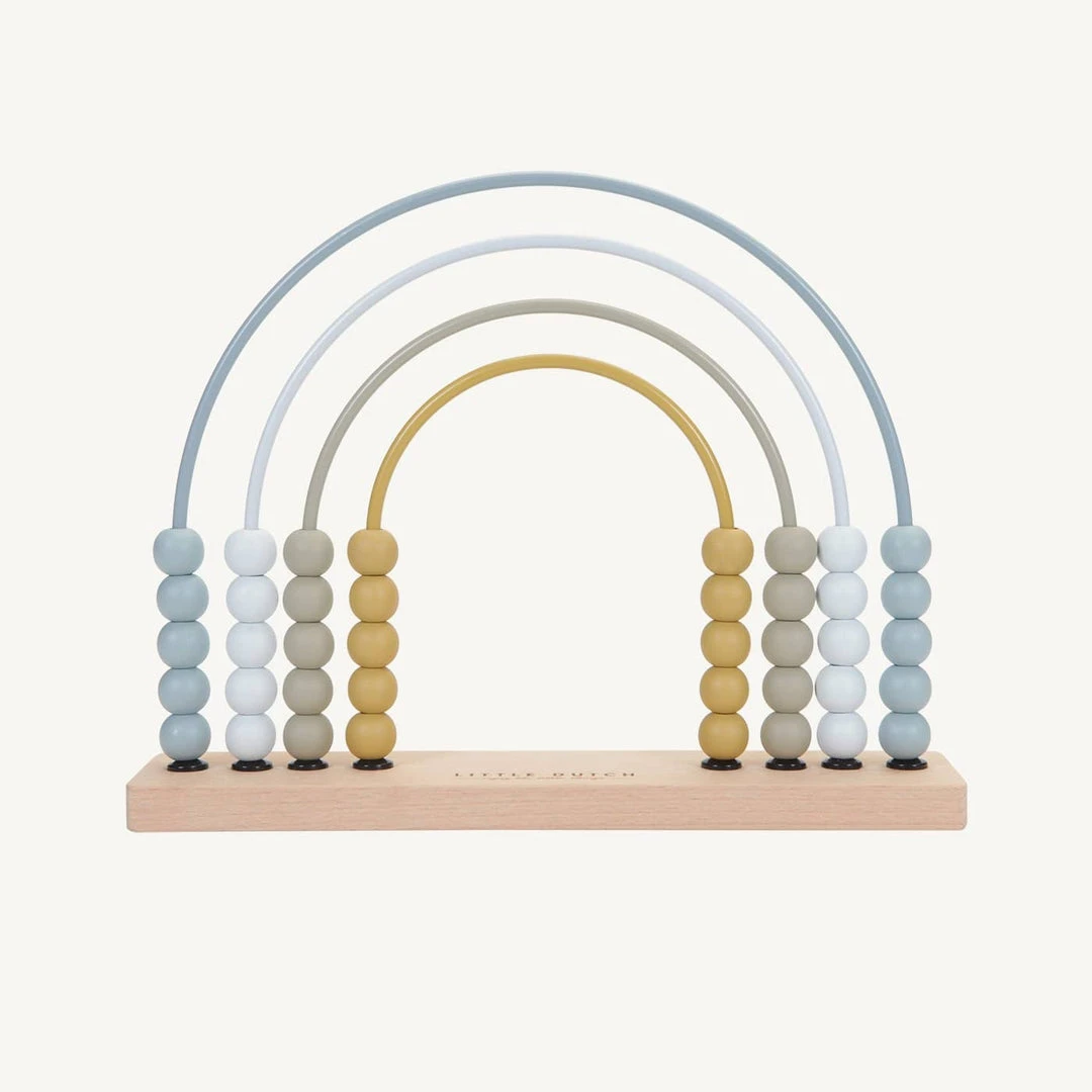 Wooden Rainbow Abacus in Blue by the brilliant Little Dutch. A classic toy, given a modern twist, this gorgeous Rainbow Abacus is a lovely addition to any playroom or living room. The rainbow is made of coloured metal arches on a wooden base with 10 wooden beads on each arch. This is a lovely educational toy that makes learning maths fun and helps your child develop skills in recognising patterns and colours, while honing fine motor skills.