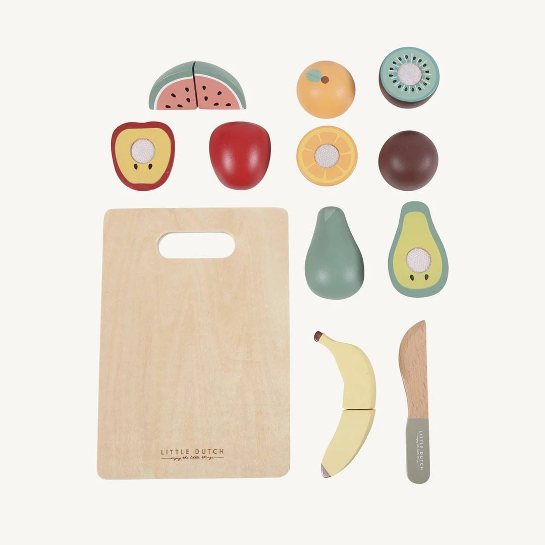 Wooden Cutting Fruit Play Set by Little Dutch. Encourage your little ones to get their ‘5-a-day’ with this lovely wooden fruit play set. The set includes a cutting board, wooden knife and 6 pieces of fruit; apple, banana, kiwi, pear, orange and water melon. The fruit can be cut in half and put easily back together with velcro. This is a lovely play set for anyone who loves role play and perfect for using alongside our fantastic range Pretend Play Toys including the Little Dutch Market Stand, Cutting Vegetables and Kitchen.