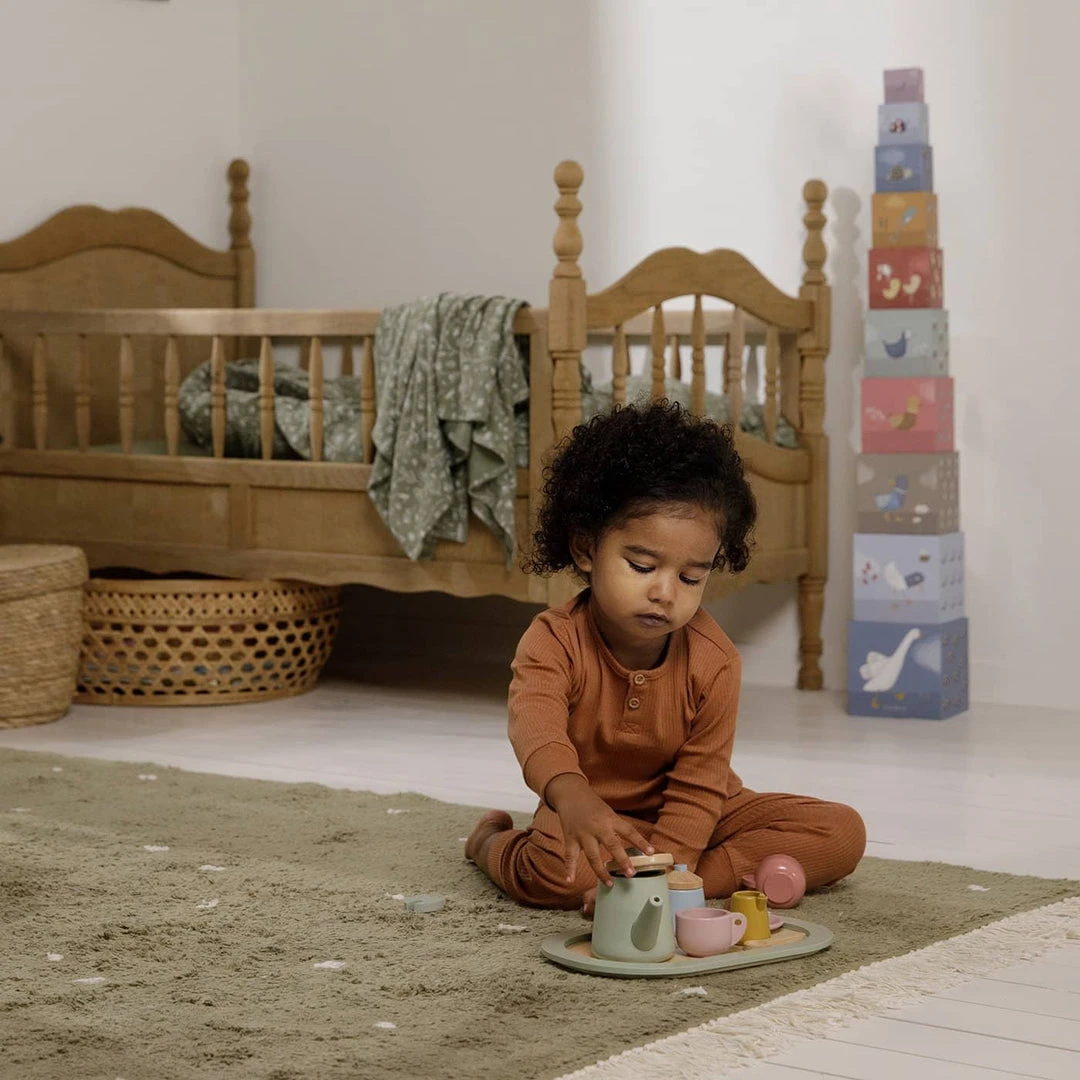 Wooden Tea Set by Little Dutch. Children love to copy grown ups, especially doing our favourites things like enjoying a nice cup of tea. With this cute wooden tea set, your little one can serve delicious cups of tea. With milk or sugar, or a slice of lemon or sprig of mint? All ingredients for a perfect tea party with friends. The Little Dutch Tea Set and includes 1 wooden teapot with lid, 1 milk jug, 1 sugar bowl with lid, 1 tray, 2 cups, 2 saucers, 2 teaspoons, 1 lemon slice, 1 mint leaf. Perfect for using with other play sets from our Pretend Play Collection.
