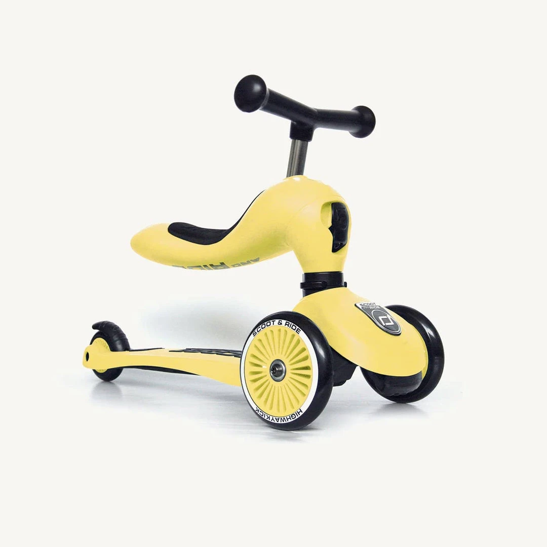 Scoot and Ride’s Highwaykick 1 is the perfect companion for children aged from 1 to 5 years . Thanks to its stability, 2 front wheels and 1 rear wheel, it allows even the youngest children to move, sitting safely and comfortably. The Highwaykick 1 is the first 2in1 kickboard / kickboard with seat that can be modified without the use of tools, worldwide. It has the lowest seat height of all kickboards available on the market. This seat height can be adjusted further without any tools and the safety pad at the front provides rollover protection, for additional safety.